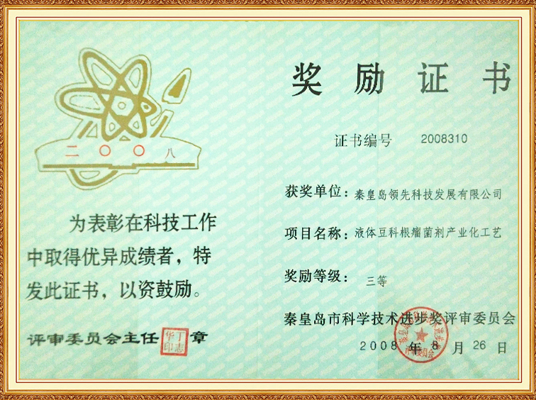液體豆科根瘤菌劑產(chǎn)業(yè)化工藝—秦皇島市科學技術進步三等獎